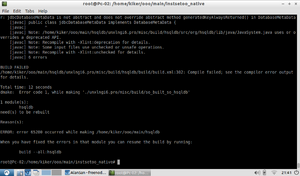 BUILD FAILED /home/alan/ooo/main/hsqldb/unxlngi6.pro/misc/build/hsqldb/build/build.xml:302: Compile failed; see the compiler error output for details. Total time: 3 seconds dmake: Error code 1, while making './ unxlngi6.pro/misc/build/so_built_so_hsqldb' 1 module(s): hsqldb need(s) to be rebuilt Reason(s): ERROR: error 65280 occurred while making /home/alan/ooo/main/hsqldb When you have fixed the errors in that module you can resume the build by running: build --all:hsqldb