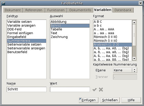 - Wählen Sie im Listenfenster Feldtyp Nummernkreis. Klicken Sie im Listenfenster Format Arabisch (1 2 3) an. Schreiben Sie im Feld Name eine Bezeichnung Ihrer Wahl (ich habe in diesem Beispiel Schritt genommen).