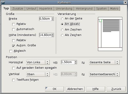 - Lassen Sie den Text noch markiert und wählen Sie Einfügen > Rahmen. In der Rahmen-Dialogbox wählen Sie die Registerkarte Typ (Abbildung 41) und geben die Breite, Höhe sowie die horizontale und vertikale Position für die Kopfzeile ein.