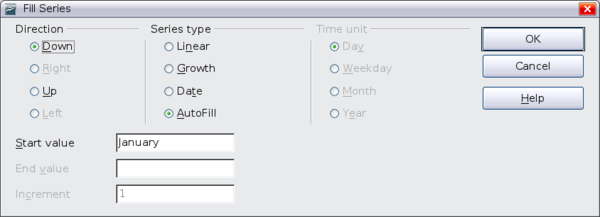 To add a fill series to a spreadsheet, select the cells to fill, choose Edit > Fill > Series. In the Fill Series dialog, select AutoFill as the Series type, and enter as the Start value an item from any defined series. The selected cells then fill in the other items on the list sequentially, repeating from the top of the list when they reach the end of the list.