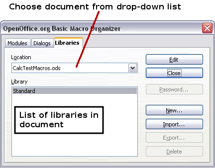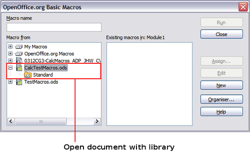 - Use Tools > Macros > Organize Macros > OpenOffice.org Basic to open the OpenOffice.org Basic Macros dialog. The Macro from box lists available macro library containers including currently open OOo documents. My Macros contains macros that you write or add to OOo. OpenOffice.org Macros contains macros included with OOo and should not be changed.