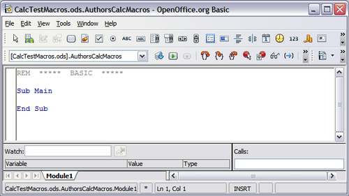 - Select AuthorsCalcMacros and click Edit to edit the library. OOo automatically creates a module named Module1 and a macro named Main.