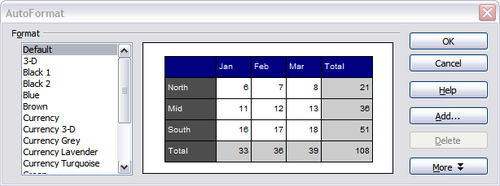 - To select which properties (number format, font, alignment, borders, pattern, autofit width and height) to include in an AutoFormat, click More. Select or deselect the required options.