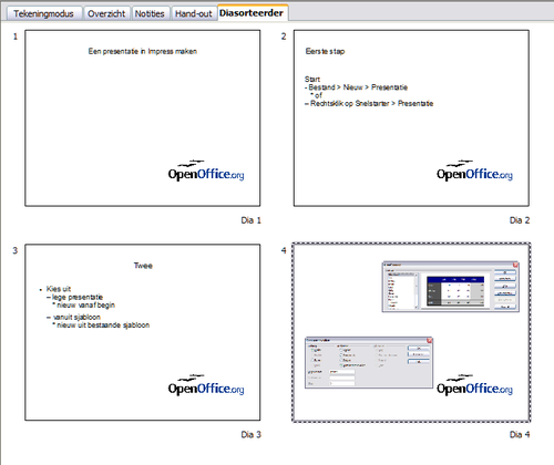 De weergave Diasorteerder bevat alle dia miniaturen. Gebruik deze weergave om te werken met een groep dia's of met slechts één dia.