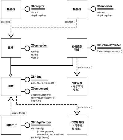 XConnection 实例现在可以用来在连接上建立 UNO 进程间桥,而不管连接是使用 Connector 还是使用 Acceptor 服务(或别的方法)建立的。为此,必须实例化服务 com.sun.star.bridge.BridgeFactory。它支持 com.sun.star.bridge.XBridgeFactory 接口。